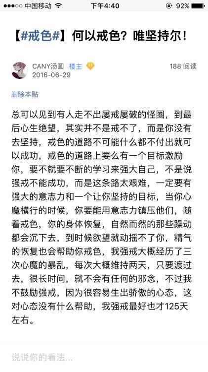 戒色这条路,我走了七年,大大小小的问题,我都见过,很多都体验过,自暴自弃过,觉得可能一辈子都没办法逃离这个罪恶的圈子里面,只能在欲望中沉沦,也无数次想要了结自己的生命,但是,我现在还是过来了,从以前每周都会破戒,到两周,到一个月,到五十天,到一百天,慢慢走了过来,虽然身体的精关已经破损不堪,但是自己也变得越来越外向,虽然偶尔有拒绝和人接触的想法,到都是在频遗以后。