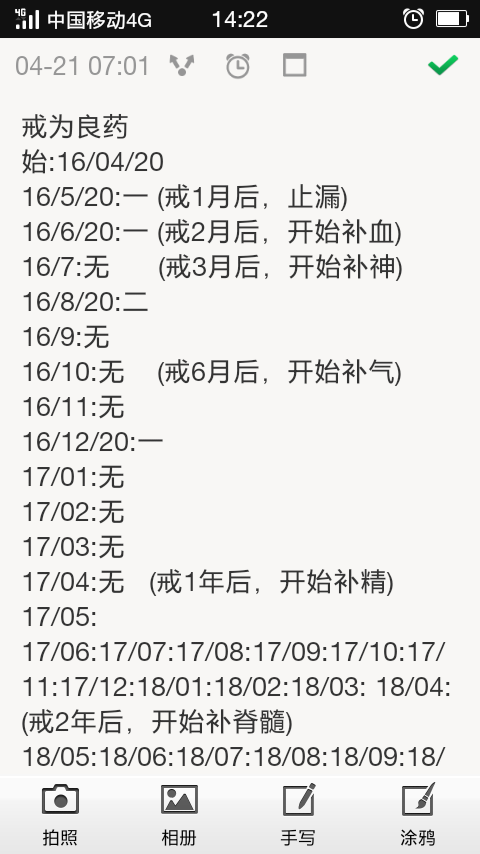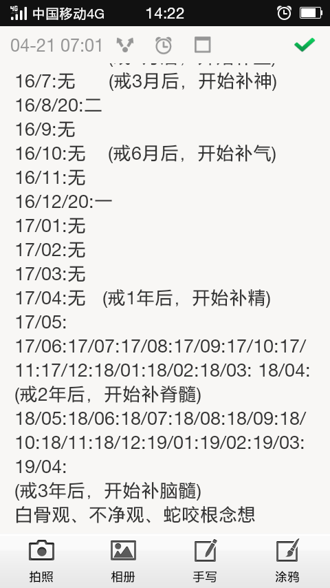 这一年精气神补上了,也只是荣华其表,内在的腰疼,背部脊柱压痛,需要更长时间的补精化髓才能康复,所以深刻领悟到了,又怎肯轻易的破戒,让好不容易修复的元气而瞬间流失掉呢。近段时间,我多次遭遇女性的暗示,有的还是已婚,很危险,面对这些我虽然控制住了,但身体还是难受,估计有暗漏。现在我的做法是学习寿康宝鉴里讲解的:烧纸。就刚才上午的时候,有位以前的女同事,她老公回老家了,就她一人在家,跟我发信息说五一一个人在家,问我在干嘛有没时间,言语间有暗示。我赶紧拿张纸条,写上:“不能,不可,为了别人家庭的幸福,为了自己人生的幸福,人妻不可犯”。写完后点火烧了。之后心里有一种完美做完一件事的感觉。也没再回复对方的信息了